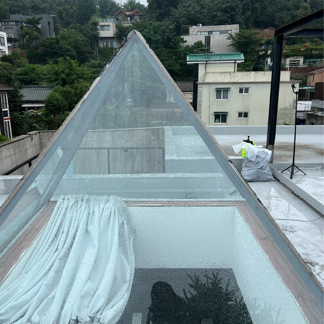 단독주택 피라미드 구조 천정창에 붙은 지저분한 시트지제거작업입니다.